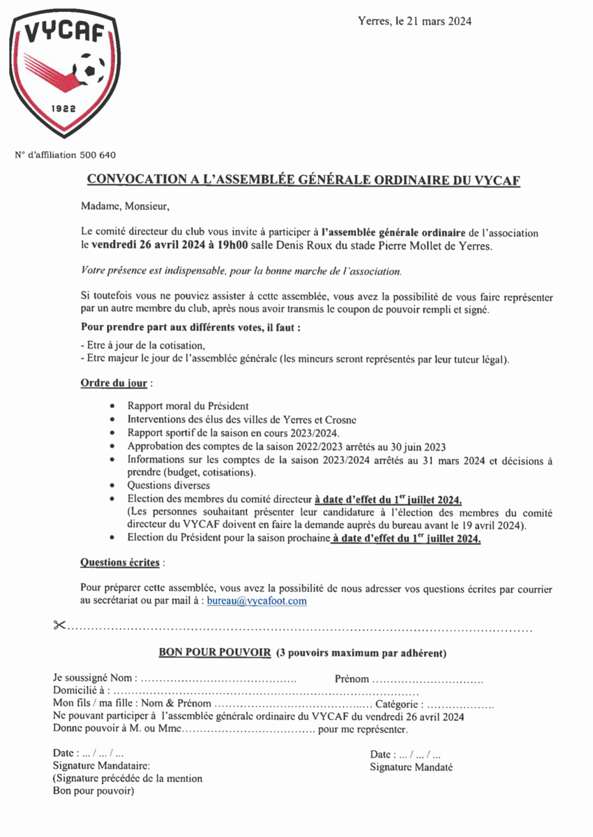 Nous vous convions à notre Assemblée Générale Ordinaire qui se tiendra le vendredi 26 avril. C'est un moment important pour notre club où nous ferons le bilan de l'année écoulée et discuterons des perspectives futures.