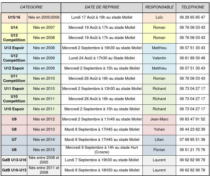 Voici les dates de reprise de chaque catégorie de U6 à U18. Après une saison tronquée, nous espérons que celle-ci ira à son terme et avec des réussites pour nos différentes équipes !